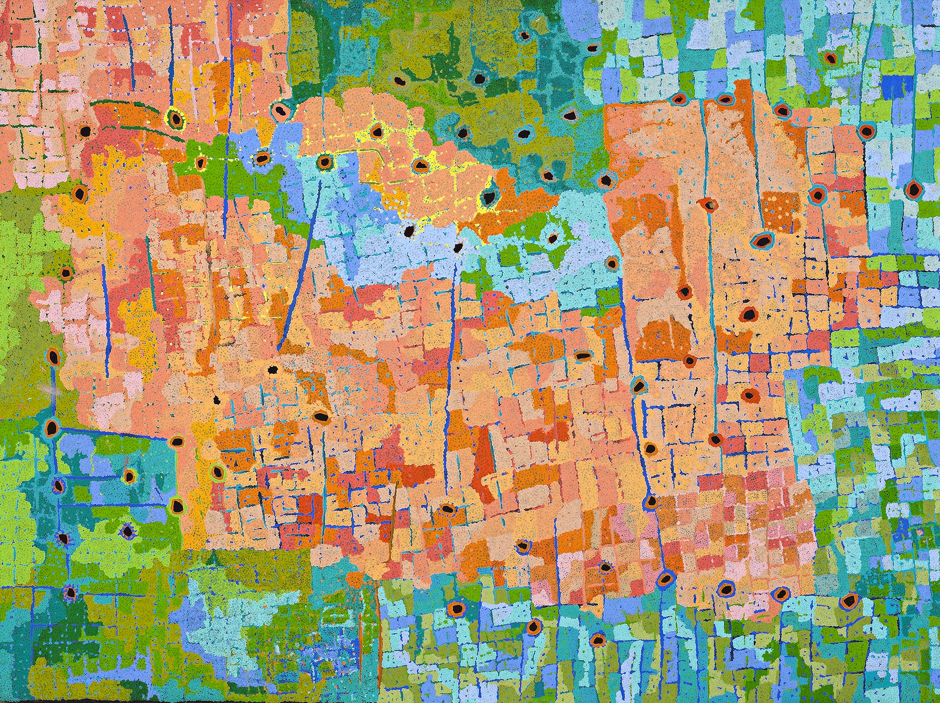In 2007, Daniel Walbidi accompanied a number of Yulparitja elders, including his father Harry Bullen (Nabiru), on a journey from Bidyadanga back to their traditional lands around Winpa and Kirriwirri in the Great Sandy Desert. The visit was intended to reinvigorate the ancestral connections between the Yulparitja and their country, and was a watershed learning experience for the young Walbidi. It was also the first time he saw his country from the air, an experience that was to have a profound effect on his painting.1 Painted later that same year, All the Jila maps out all the freshwater sites at Karrparti, Kawarr, Jurntiwa and Wirrguja within a tapestry of colour and forms that was to become the hallmark of Walbidi’s painting.