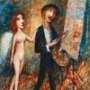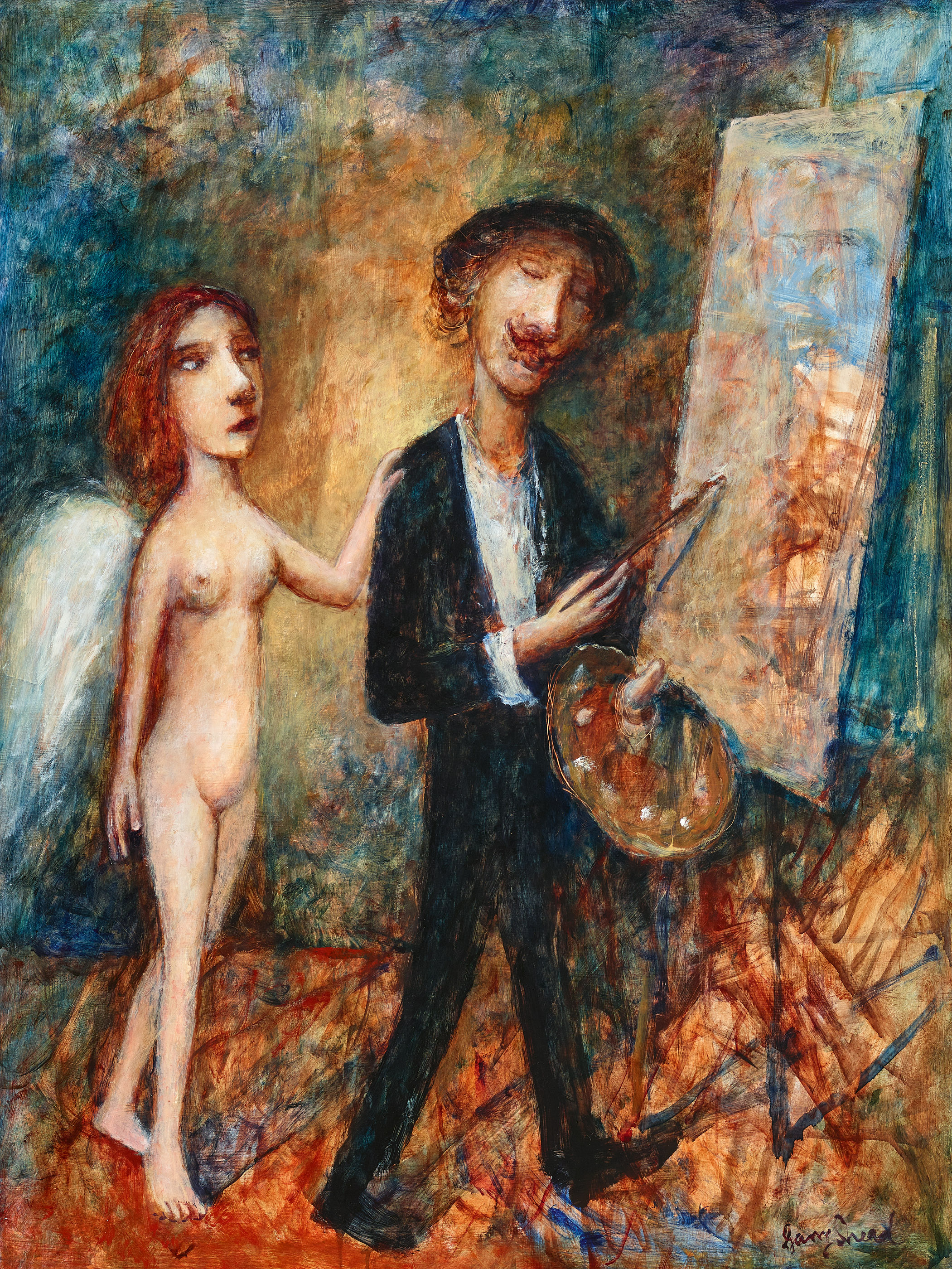 Emerging almost seamlessly from the ‘Dance’ series during the late 1990s, the ‘artist and muse’ paintings, superbly encapsulated here by The Angelic Muse, Velázquez 2001 pay tribute to the techniques of the great European Masters - Goya, Velázquez and Rembrandt - by capturing a vision of the Muse that inspired their creative journeys. Thus depicting the Masters themselves in the intimate act of creation, the works typically feature the artist accompanied by the mythical muse of poetry, Erato, who appears as something magical, often hovering spirit-like in the studio and bathed in a radiant light. Notwithstanding the ostensibly secular iconography however, the figures seem to inhabit spiritually-charged spaces – there is profound tenderness in the artist's gaze for whom the Muse is a luminous revelation, guiding the Master's hands, cradling his palette or even taking brush to canvas.