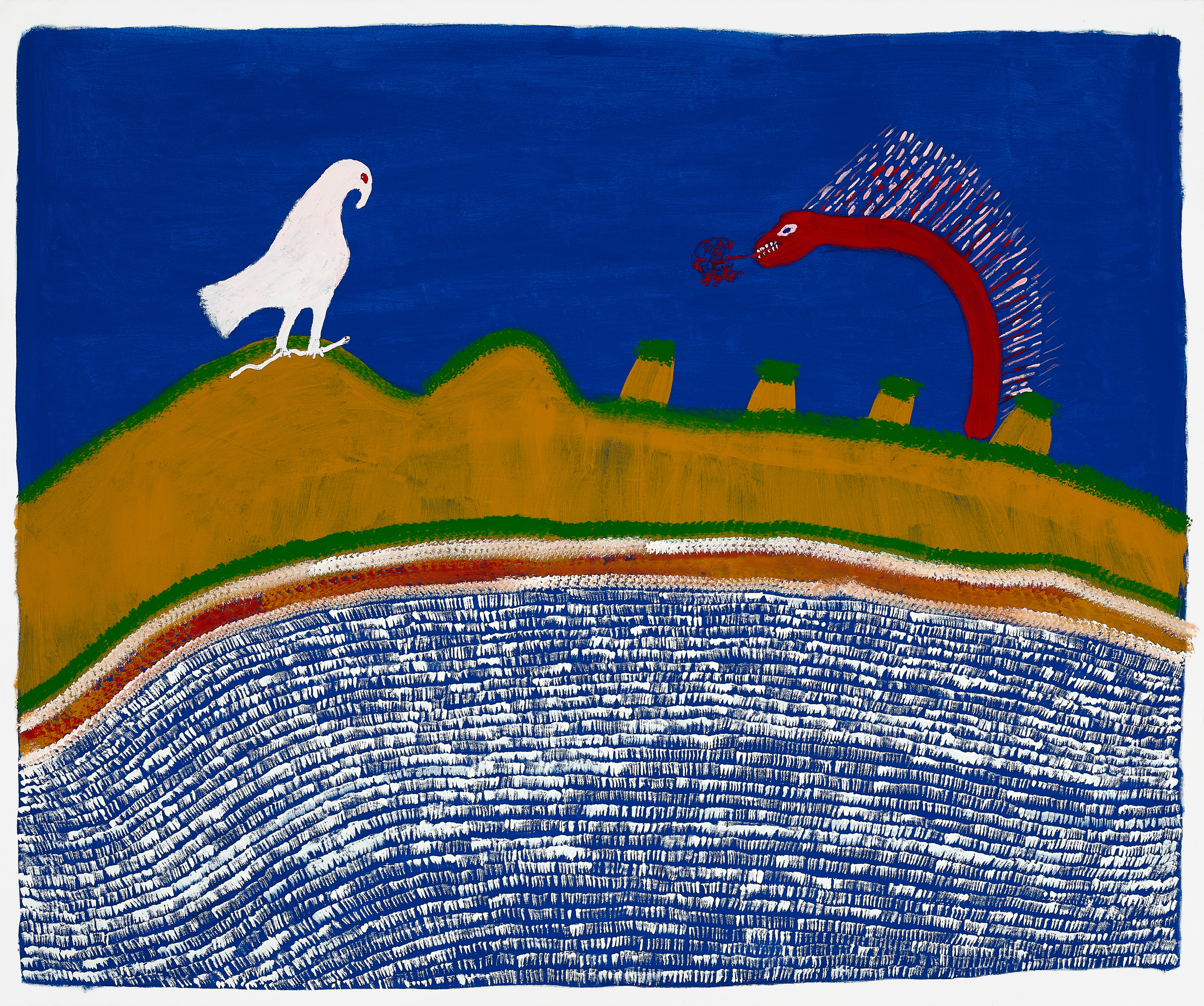 Significantly exhibited in this ground-breaking retrospective, Angry Bulukbun, 1990 offers a stunning example of Riley’s heroic landscapes inspired by his mother’s country – specifically, the saltwater area extending from the coast of the Gulf of Carpentaria along the Limmen Bight River to the weather-worn rocky outcrops known as the ‘Four Archers.’ Pivotal to the composition is Ngak Ngak, the white-breasted sea eagle depicted in profile who plays the role of sentinel or guardian protecting the country, and on the right, the powerful creator-snake Garimala who is here dramatically transformed into the fierce, fire-breathing serpent-dragon named Bulukbun. According to the ancestral dreaming, this mythological Taipan created the Four Archers – an area regarded as ‘…the centre of the earth, where all things start and finish’3 – and lives in the waterhole nearby. If elsewhere in Riley’s oeuvre Garimala is depicted as a pair of snakes (a typical convention to denote his travelling) or a rainbow (symbolic of water, the seasons and the life cycle), when portrayed in the guise of Bulukbun, he is invariably angry, as illustrated by the expanding scaly spines on his back and his fiery breath. Indeed, as the artist notes, the more aggressive Bulukbun becomes, the more he raises the spines on his back, while his forked tongue and the deadly flames he expels (or streams of bubbles if he is underwater, as pictured here) are a strong warning to all to keep their distance.4