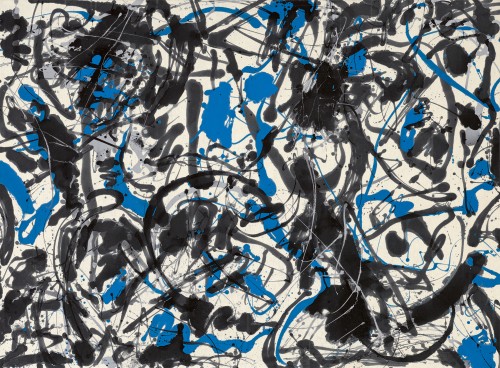 In the earlier, Untitled, 1970, deftly controlled drips and sweeps of black paint become a stained choreographed calligraphy. The execution is flowing and lyrical with each action held in check.3 In Anthropology, painted three years later, a commanding robustness energises the surface. The looping and swirling lyricism in black, blue and silver-grey inflections is quite unlike Australian lyrical abstraction of the time – its unapologetic debt to Abstract Expressionism becomes a rethinking of a painterly genre which had held a lifelong preoccupation.