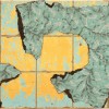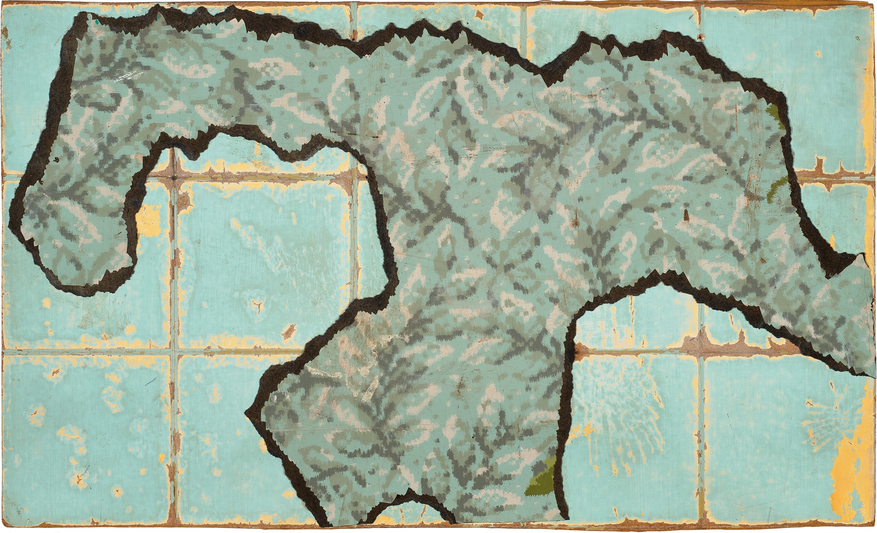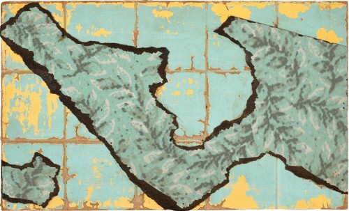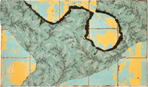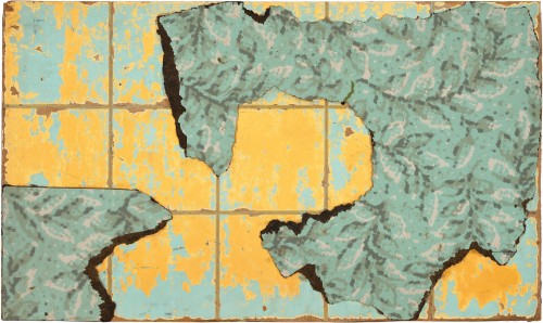 torn and cut patterned linoleum on treated Masonite panels on composition board