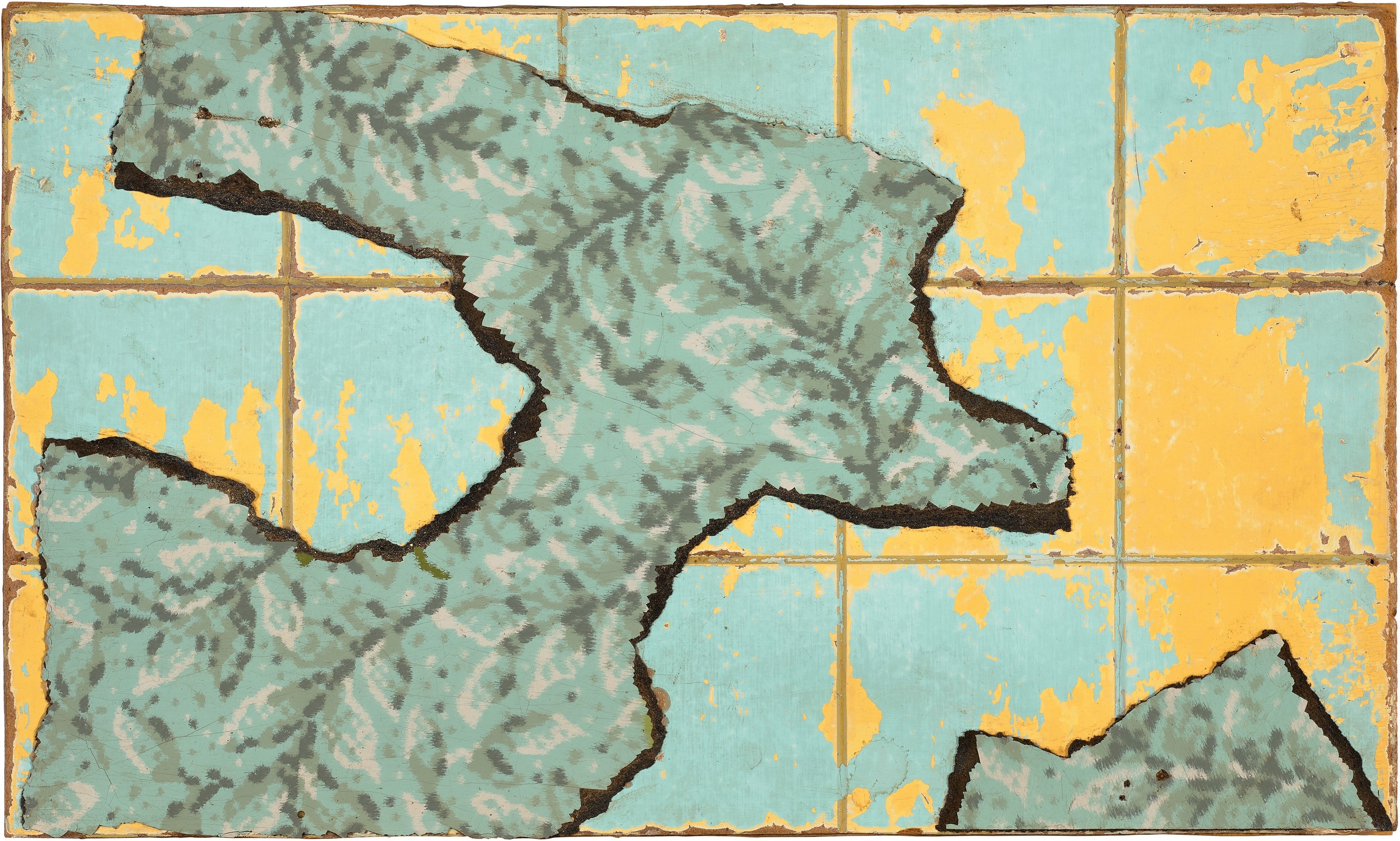 Made late in the artist’s career, Archipelago, 1993 demonstrates the way in which Gascoigne returned to her vast material stockpiles over the decades, using a particular material when both the mood and intuition inspired her. Between 1977 and 1993 she made around fifty works with lino, with over fifteen different patterns, in what was, in her words, a ‘twenty-year love affair’.4 As the artist’s studio assistant, Peter Vandermark has observed, Gascoigne ‘liked the hazard of not knowing’,5 and would have initially worked on the individual units of Archipelago with no predetermined sense of its final scale. On completion, the individual panels would similarly have sat in her studio for a time before being named. Gascoigne preferred to allow her works to simply ‘be’, waiting until the moment when the work itself presented an evocative title that managed to open up, rather than shut down, its allusive possibilities.