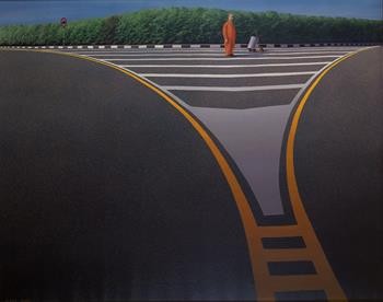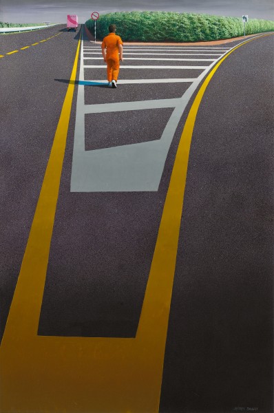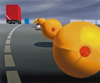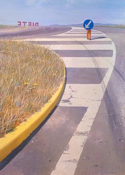 Undoubtedly one of the great paradoxes of Jeffrey Smart’s widely acclaimed legacy is that symbols of modernity, urban pressure and activity such as freeways, road signs and trucks should be imbued with an aura of stillness, order and timeless serenity more reminiscent of the Italian Quattrocento painting he so admired. For while drawing inspiration from the urban environment that has flourished in Italy since the Second World War, Smart’s immaculate compositions invariably bear no trace of the chaos or randomness of the world from which they derive. Rather, meticulously distilling his subject of the modern city down to its purely formal qualities in a manner echoing his artistic mentor Cézanne, Smart encourages his audience to see the ‘everyday’ with fresh eyes – to discern beauty in the most unprepossessing, unromantic of subjects. With its signature motif of a broad sweeping bitumen arterial seen from a low perspective and disappearing to an unknowable destination beyond, The Arezzo Turn-Off II, 1973 offers a magnificent example of the mastery and miracle of Smart’s art, encapsulating his unique ability ‘to elevate mundane familiarities… to the status of semi-mystic icons’2. Redolent with his love of ambiguity and seductive in its ‘super realism’, indeed the work is Smart at his finest, betraying strong iconographic affinities with some of the artist’s most celebrated works, including the iconic The Guiding Spheres II (Homage to Cézanne), 1979 – 80 (private collection).