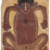 There are a wide variety of spirit beings, generically known as jimi, inhabiting the world of the people of the north Kimberley - some are benevolent and play an important role in ensuring there will be a regular supply of bush tucker including wild honey or sugarbag. Others however, are malevolent and very dangerous. Exaggerated ears and the pronounced claws or talons identify the subject of this picture as an evil sprite or spirit being. It may represent either an arkula - an evil aspect of the spirit of a dead person or, as the subject appears to be female, it may depict Jilinya, a fearsome female spirit who inhabits the bush and preys on humans.4
