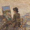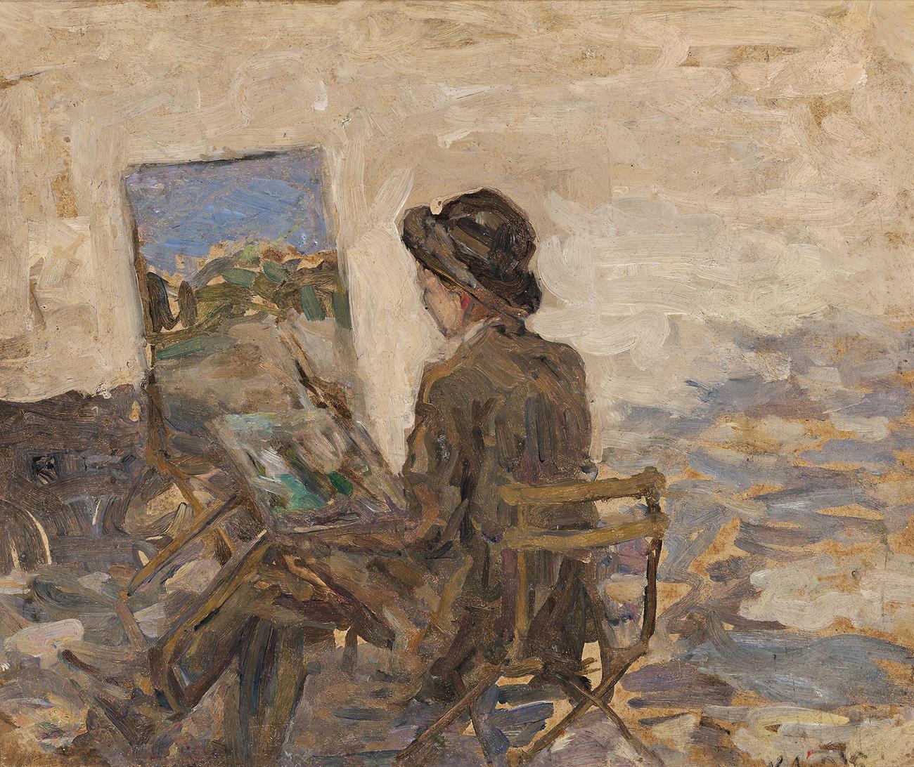 Given that it is painted on board, Artist and Easel, Luxembourg Gardens, would likely have been part of O’Connor’s second sequence of Gardens paintings created immediately after World War One and, through the inclusion of the subject’s own attempts at the easel, provides a distinctive contrast with many of its painterly companions. For the greater part, O’Connor utilised muted tones of beige, caramel and stone, with only occasional, though relatively subdued, flashes of colour. In Artist and easel, Luxembourg Gardens, however, the depicted artist has looked out – not inwards like O’Connor – and the burst of blue sky and verdant greens punctuate the picture plane. It also highlights that O’Connor’s choice of otherwise muted tones was a deliberate tactic, and through this, an inevitable sense of melancholy and wistfulness permeates these views.