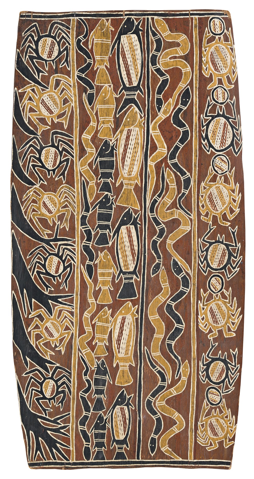 This painting depicts some of the artist's totems; the hermit crab, little snakes, and black fish travelling about in Guningbal's country