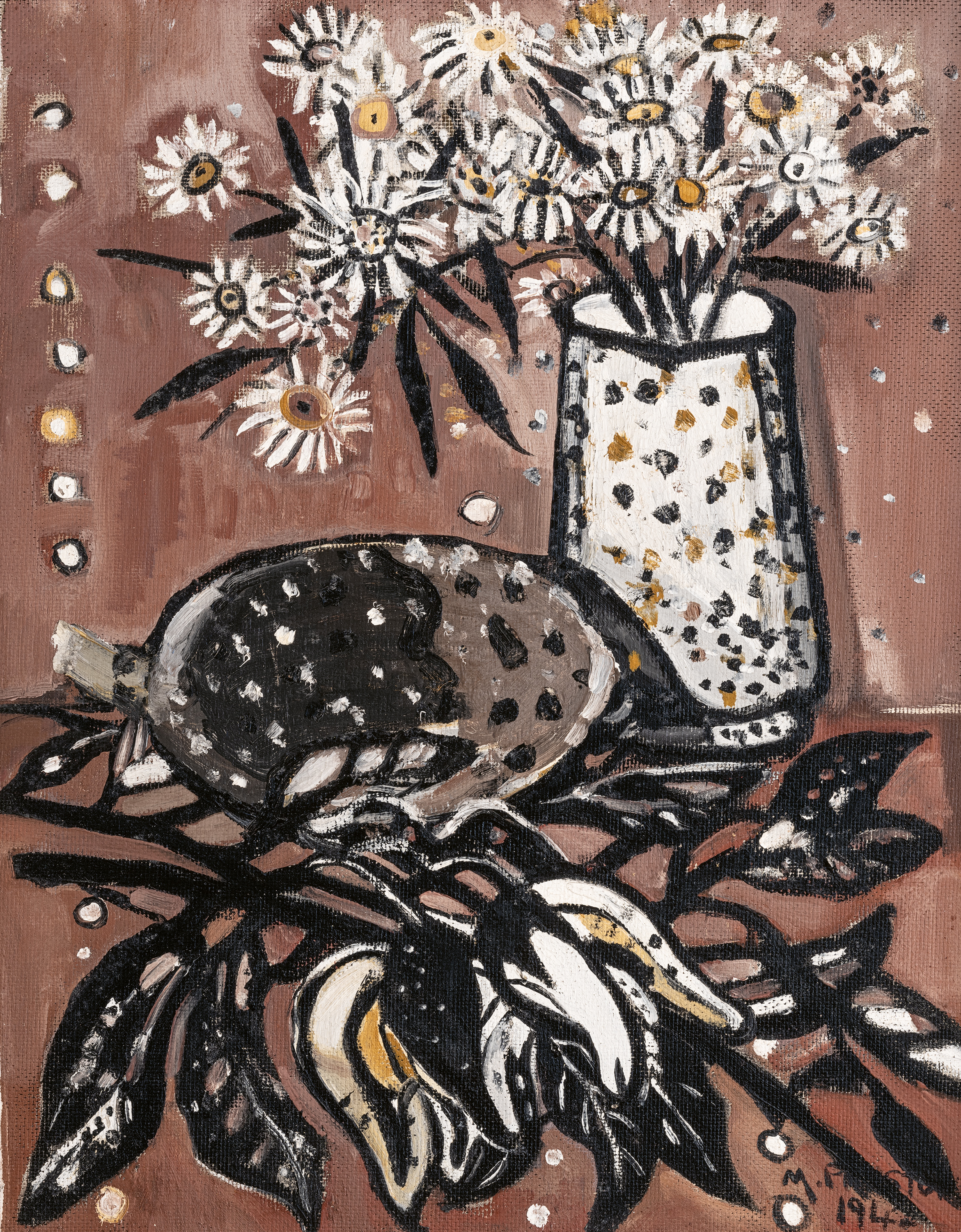 Australian native pear, 1942, belongs to a suite of paintings by Margaret Preston that are amongst her most challenging. These include: The brown pot, 1940 (Art Gallery of New South Wales); Still life – Australian (or Aboriginal still life), 1940 (Queensland Art Gallery), and Aboriginal landscape, 1941 (Yale University, Connecticut), all of which incorporate a ‘subdued, simple and severe’ palette drawn from Indigenous Australian art.1 Preston truly believed that an authentically Australian art could only be attained after first understanding and respecting the connection that Indigenous art has with country. In the 1920s and 30s, Preston’s fervent advocacy ‘was not only radically ahead of her time, but involved a personal evolution for the artist.’2 Her first essay on Indigenous art was published in 1925, and her appreciation deepened during 1932-39, when she lived in the bushland adjacent to Ku-ring-gai Chase National Park, on Darug lands north of Sydney.3 In the early 1940s, she undertook extended journeys across northern Australia visiting galleries of rock art and paintings.