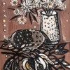 In Australian native pear, Preston has reduced her palette so dramatically that the background of table and wall are rendered solely in brown. Through this tactic, she sought to emulate the ‘above’ view of indigenous painters, as if working flat on the ground as opposed to the easel; and the flash of white to the right is the only suggestion of depth of field. Understood this way, the pear and the seed pods appear to float above an indeterminate space punctuated by ‘dot and cycle’ motifs from Central Australia.6 Preston also experimented with her own earth pigments that she had sourced in the Northern Territory, warming the yellow ochre before grinding to enrich the colour.7