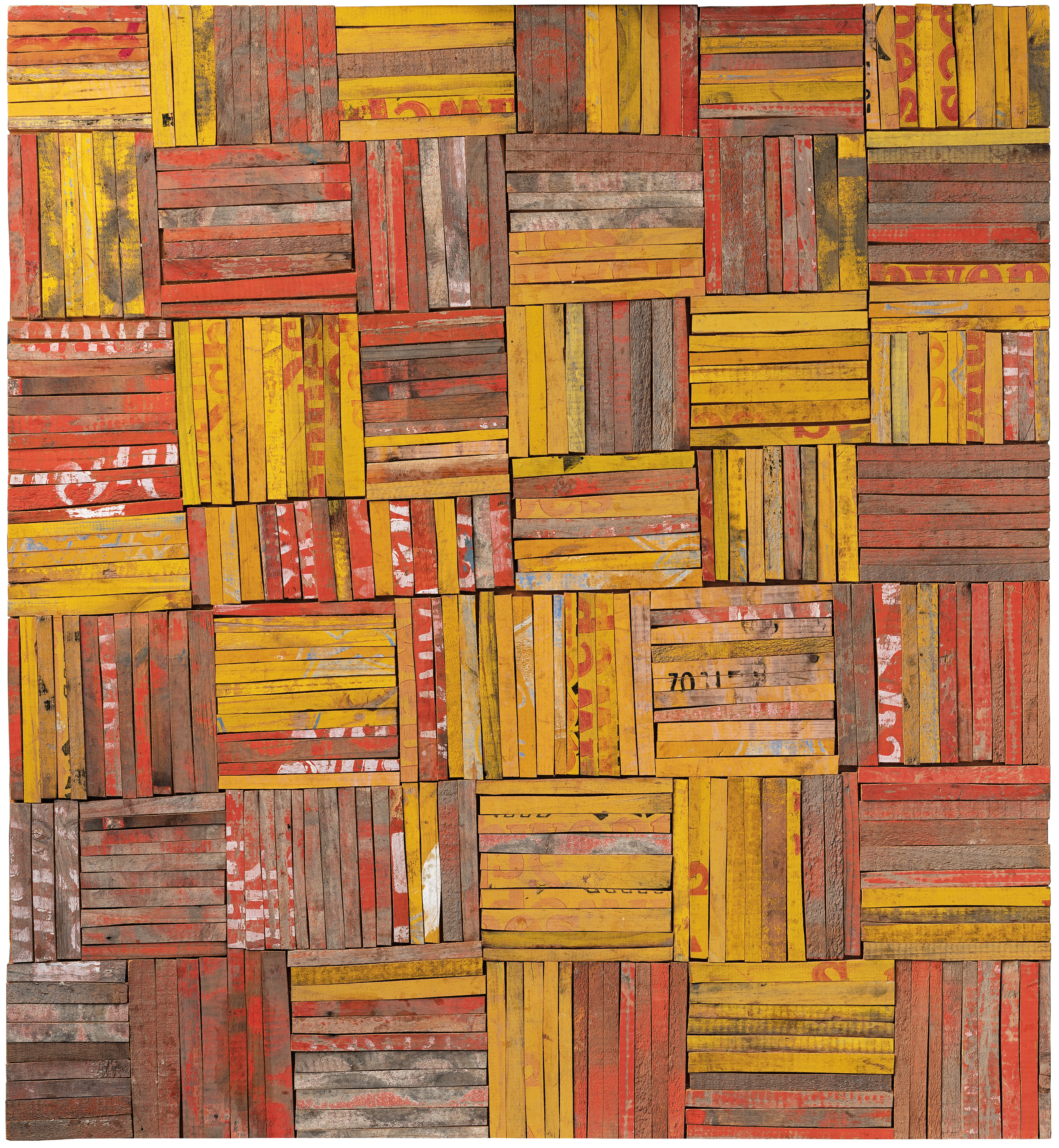 painted and stencilled sawn wood from discarded soft drink crates on plywood backing