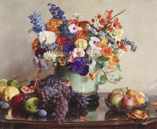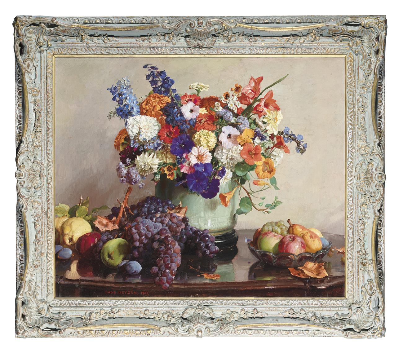 signed, dated and inscribed on backing board verso: “Autumn Flowers and Fruit” / Hans Heysen / Ambleside / 1927 – 1929