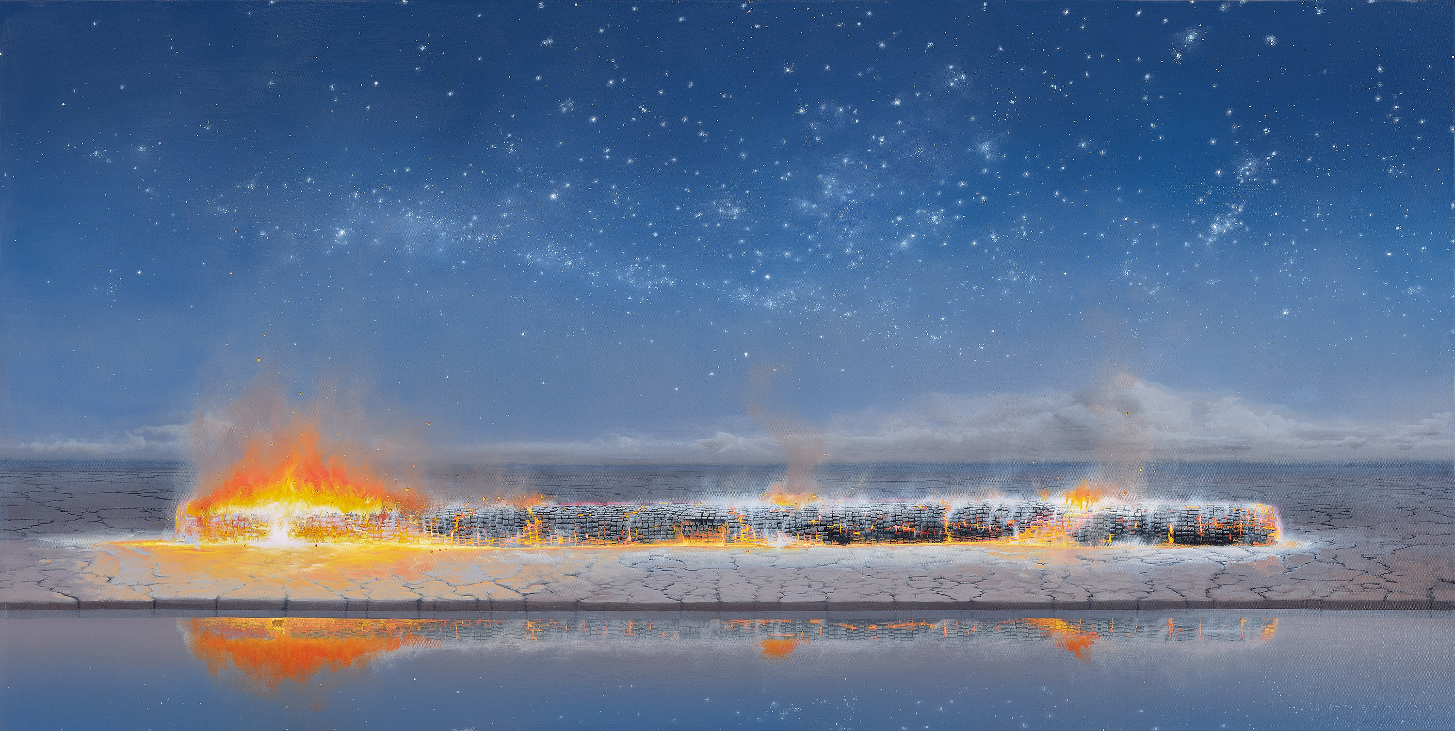 While continuing this interest in the four elements and the power of life which they embody, Autumn Night, 2009 nevertheless reveals a significant shift in the artist’s vision during the opening decade of the new millennium. Where previously his interpretations had been literal and direct, now his treatment is more subdued, reflective and abstract, with fire (the burning logs positioned lower centre) occupying an almost secondary role to the dazzling celestial sky and billowing, voluminous clouds that hover above the parched plains and are reflected in the expanse of still water beyond. Elegant and minimalist, indeed the nocturnal scene offers an arguably more sophisticated exploration of the emotive, melancholic mood that has always pervaded Storrier’s oeuvre, drawing upon the symbolism of the fading light of day as a metaphor for change or the fin de siècle, end of an era. Similarly, the juxtaposition of fire with an entirely different great vastness here (infinite celestial skies and untraversed bodies of water), no doubt suggests further allusions to evolution, the passing of time and the grandeur of decay in the same vein as the traditional vanitas still life. As Storrier himself muses, '... there is a relationship between fecundity and mortality, between something that is wet and something that is burning. These are primal poetic qualities that do not change in terms of the human spirit’.2