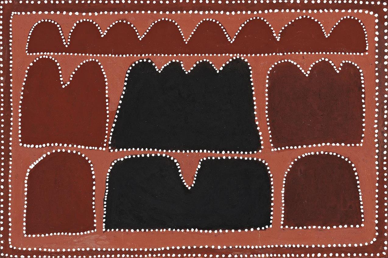 This work is accompanied by a certificate of authenticity from Waringarri Aboriginal Arts that states: ‘This painting shows country to the east of Turkey Creek. At the top of the picture is the long range called Balankerr by the Gija people. It can be seen to theb south when following the road between Turkey Creek and Texas Downs Station. It is a very long steep unbroken hill. If seen from the air it could be described as “like a fence” as the artist does. In the middle is country called Lajibany where there are lots of springs and a creek flowing down to Texas Downs. At the bottom is a hill called Manyjooroo, literally “knees”.’