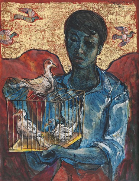 signed and inscribed with title upper right: Balinese with cage / Birds / Donald / Friend