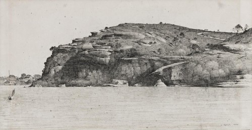 Many of the drawings from this time depict scenes around Sydney Harbour, but it was Balls Head to which Rees returned again and again. ‘Balls Head was a favourite early motif. Drawn from the distance, from sea level at Blues Point … the series of drawings gives Balls Head a mass equivalent to its psychological effect. Its rocky formation is drawn as with a chisel. The first drawing captures the full drama of the forms, in later versions he elaborated the foreground’.2