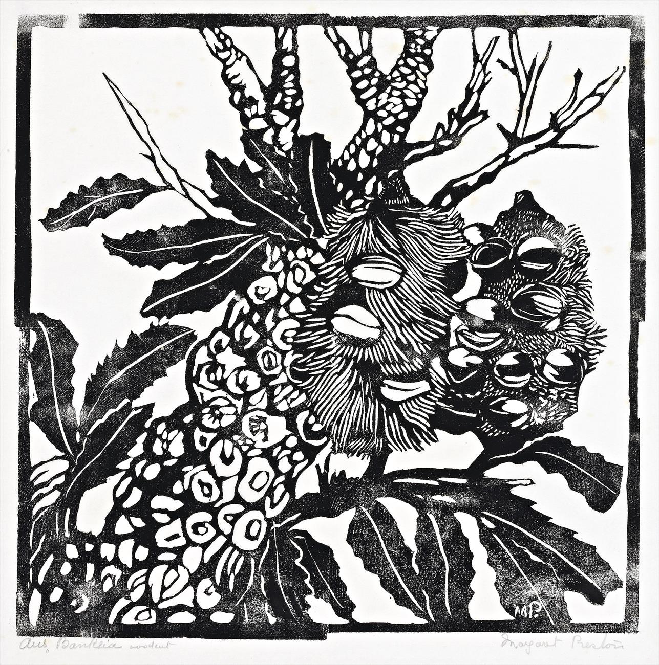 signed and inscribed with title below image: aus,, Banksia woodcut Margaret Preston