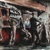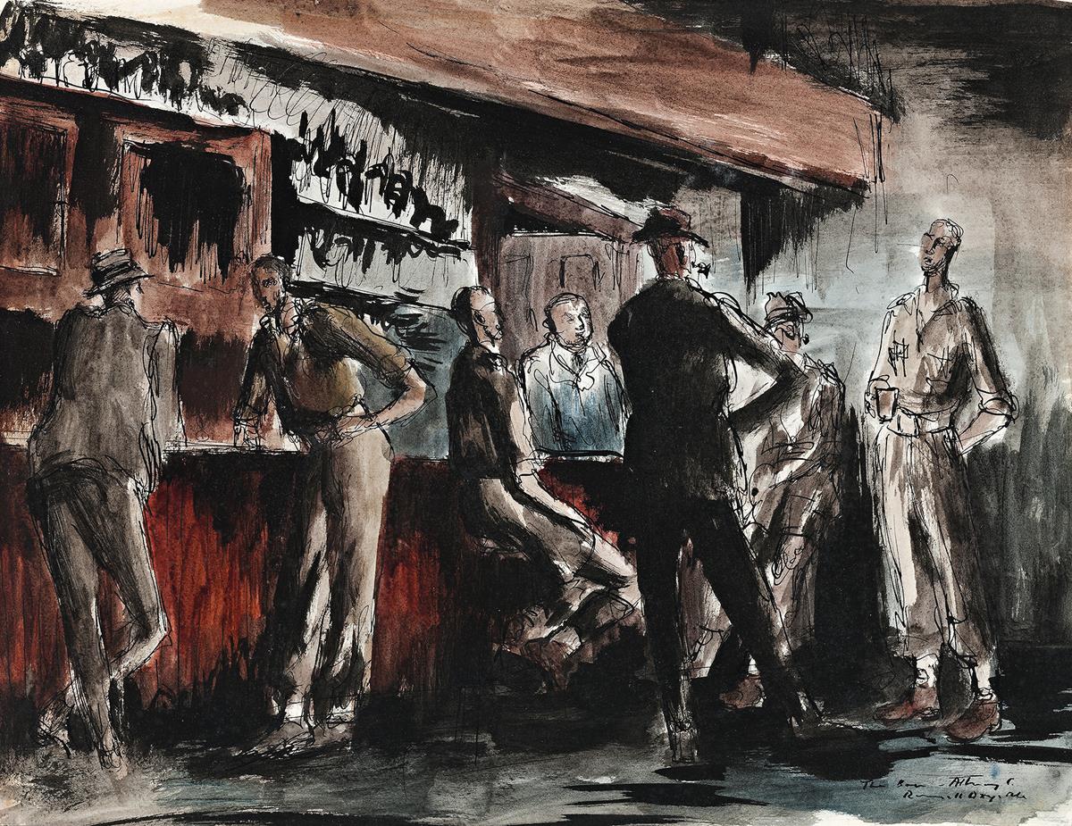 It is the presence of two soldiers drinking with their civilian friends in The Bar – Albury, c.1942-43 that links this drawing to the series of major paintings and works on paper that emerged from Drysdale’s experience in Albury, including The Station Yard, 1943 (National Gallery of Victoria) and Albury Platform, 1943 (Albury Regional Art Centre). Drysdale was a gifted draughtsman who once said that ‘drawing is as essential to an artist as practising scales to a pianist’4 and his facility is clear in this work where the figures and details of the interior are defined by quick but assured pen and ink lines, volume is added with a brush and black ink and finally, subdued tones of watercolour activate the composition. Both the setting and the relaxed camaraderie of the laconic figures make this a classic Drysdale depiction of Australian country life that is at once familiar and, almost eighty years on, also tinged with a sense of nostalgia.
