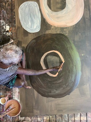 A leader in the innovation of contemporary bark painting, Noŋgirrŋa has pushed the boundaries of what Yolŋu law permits in its art practice. She uses sophisticated gestural abstraction to respectfully disavow any sacred intent, while keeping a personal foundation to its artistic vocabulary. The qualities of her expressive abstraction have enabled public institutions such as the National Gallery of Australia and the Art Gallery of New South Wales to recently reposition her work adjacent to (and in discussion with) artworks by Tony Tuckson and Rosalie Gascoigne in their permanent collection galleries. Her technical innovations, including use of printer cartridge ink and composition boards such as featured in Baratjala, bypass the seasonal limitations to the harvest and preparation of stringybark wood, allowing her to continue producing artworks all year round. Her creative interpretation of the rules has both carved out as space for her own practice and broadened Yolŋu and external understanding of what bark painting can be in the contemporary world.