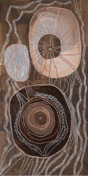 Painted in deep hues of burnt umber and ochre, starkly contrasted with overlaid lines of white gypsum, the tones of this work signal Noŋgirrŋa’s return to the natural pigments of Yolŋu art after a period of experimentation with bright synthetic inks from printer cartridges in 2017 – 2018. For Yolŋu, it is customary to paint country using only materials collected from country. The muted shimmering tones of Baratjala creates a warm and melancholic effect. This mirrors the role of senior women in ceremonial song cycles, who instead of singing, perform the milkarri (crying songs) as explained by the artist’s brother, Djambawa Marawili AM, ‘her paintings cry for the land’.1