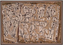 The end of 1956 saw the construction of a second, larger hut which heralded the production of paintings on a bigger scale such as Roi Soleil, 1956 – 57, and its purchase by the Art Gallery of New South Wales the following year was encouraging. Soon after, Fairweather began to use the new synthetic polymer paint (often in combination with gouache) which dried quickly and, unlike oil paint and other less stable media, suited his way of working. Returning to pictures again and again over an extended period of time, he developed complex, layered images which vibrate and shimmer with movement.10 Fairweather himself recognised a distinctive shift in the work produced following the move to Bribie, dismissing what had come earlier as ‘nothing new’ and, although his self-assessment was unduly harsh, the major works of the late 1950s and 60s are powerful expressions of an artist in full flight.