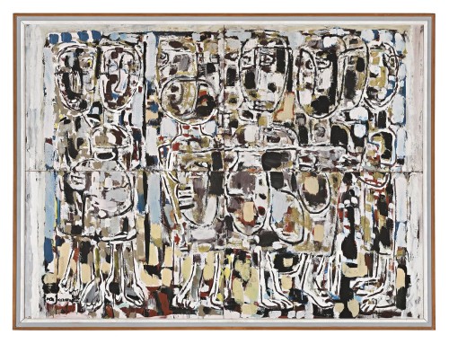 In mid-1953 Fairweather returned to Australia and later that year settled on Bribie Island, off the coast of Queensland, where, for the rest of his life, he famously lived in a pair of huts built with materials salvaged from the surrounding bush. The conditions were primitive – no running water, sewerage or electricity – and Fairweather’s handmade bed and chairs were reportedly upholstered with fern fronds.7 Despite the rudimentary nature of his surrounds however – or perhaps because of it – the next two decades witnessed the production of many of Fairweather’s finest paintings and the 1960s saw his art acknowledged in significant ways, with works being included in the landmark exhibition Recent Australian Painting at the Whitechapel Gallery, London (1961), the European tour of Australian Painting Today (1964 – 65) and in 1965, a major travelling retrospective of his work – which included the painting on offer here – was mounted by the Queensland Art Gallery.