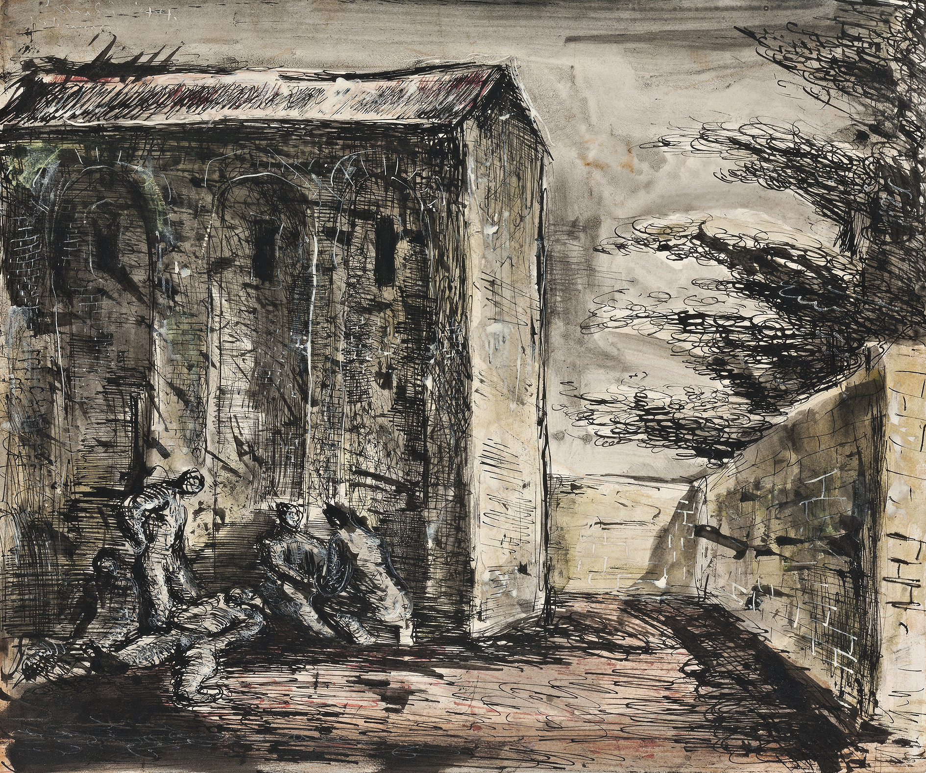 signed, dated and inscribed with title upper left: Donald 44. / The Barracks.