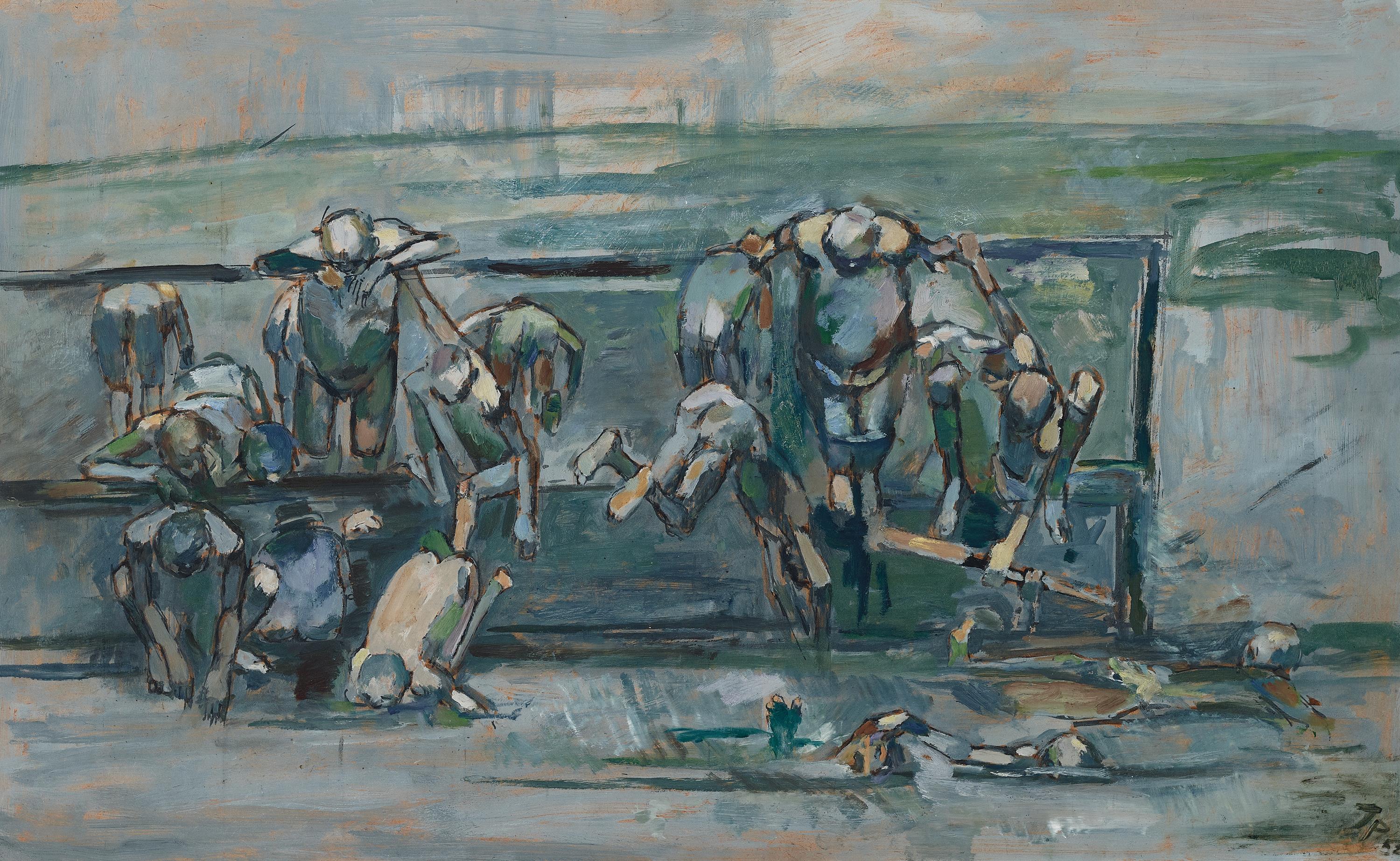 Bathers, 1952, is a major example of Passmore’s painting, which would fit perfectly amongst the group belonging to the Art Gallery of New South Wales. These delicately tuned compositions, poised precisely between chaos and order, successfully evoke the playful atmosphere, mood and energy of the entire activity, rather than merely depicting one aspect of the scene.