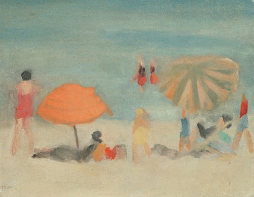Beckett’s paintings are evocative, poetic ruminations on the world around her, and companion works to Beach scene include Sandringham beach, c.1933, and Yachts in the Bay, c.1933 (both in the collection of the National Gallery of Australia); and Beach scene, 1932, The red sunshade, 1932, and Bathing boxes, Brighton, 1933 (all in the collection of the Art Gallery of South Australia).
