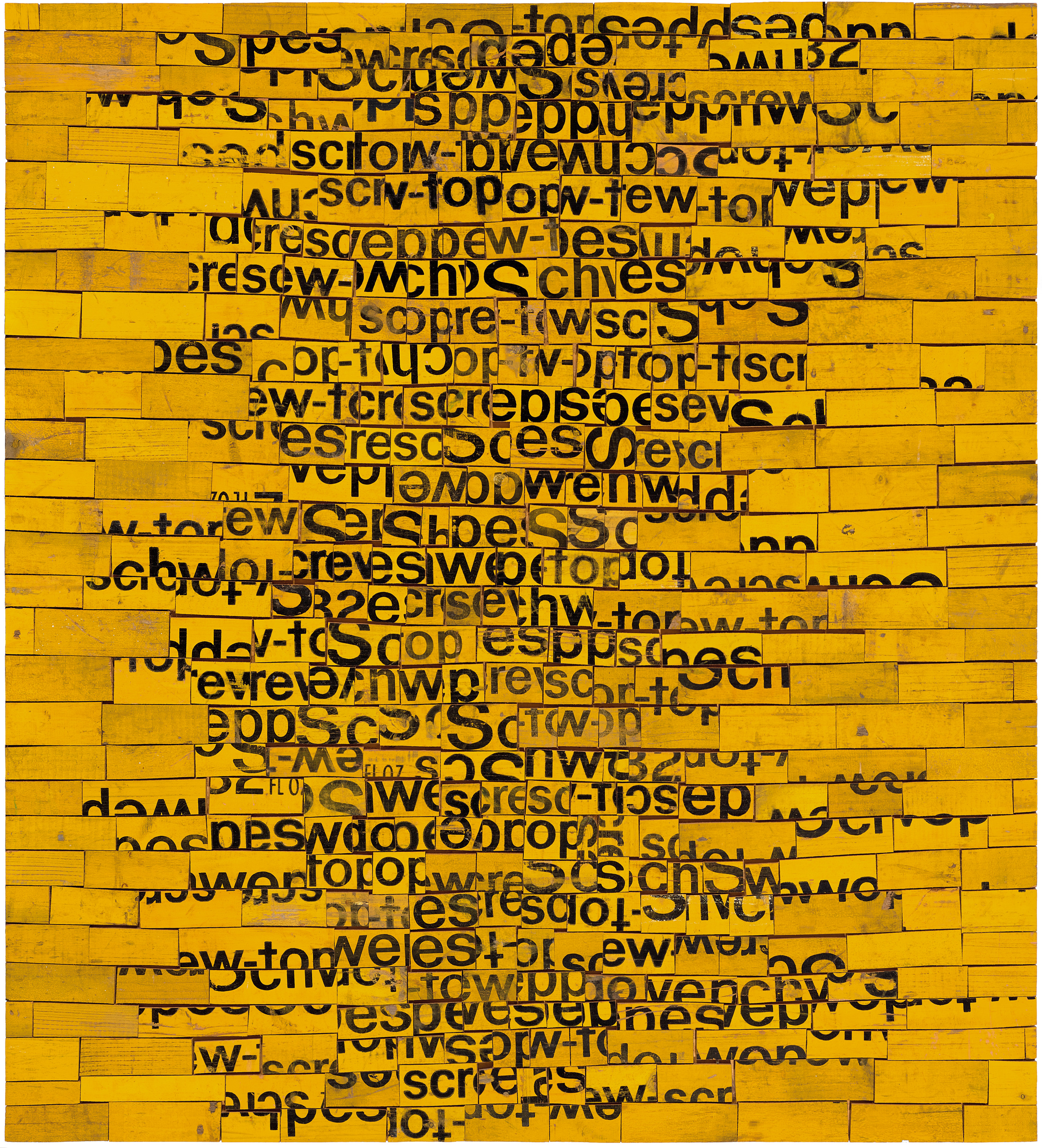 With their rhythmic pattern composed of letters – ‘text transformed into texture’ – such assemblages have, not surprisingly, been described as ‘concrete stammering poems’4, a perceptive analogy given the artist’s predilection for poetry from Shakespeare to Plath. Nevertheless, Gascoigne reiterates that the flickering word fragments, though carefully arranged, are not intended to be read literally: ‘Placement of letters is important, but it’s not a matter of reading the text – it’s a matter of getting a visually pleasing result.’5 Similarly, her titles are also not prescriptive but rather, ‘leave room for the viewer’6, imbued with various levels of meaning to be deciphered according to the nature of one’s experiences.