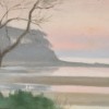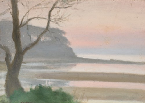 Clarice Beckett is renowned for her sustained, early modernist vision of Melbourne, particularly focussed on the coastline near her home in the Bayside suburb of Beaumaris. When asked why she never desired to travel overseas, she replied ‘I have only just got the hang of painting Beaumaris after all these years, why should I go somewhere else strange to paint?’1 Beaumaris sunset is a wonderful example of her work, featuring the rugged coast at the end of Dalgetty Street, where the artist lived. The upper layers of the headland are comprised of Black Rock sandstone which have eroded over time to reveal the lower basalt level. Middens and hand-dug wells from the Bunurong people remain in clear evidence along the cliff’s base, as does a plethora of important marine fossils in the shallow waters offshore (now protected). The headland and its near neighbours also feature in such notable works as Tom Roberts’ Slumbering sea, Mentone, 1887 (National Gallery of Australia); and Arthur Streeton’s Fossil bay, flood tide, 1925 (private collection). In Beckett’s view, the falling light of sunset and the mirrored surface of the still waters emphasise the brooding aspect of the headland, with the lone tree to the left recalling the composition of Japanese woodblock prints. A small number of her works feature similarly placed trees, such as View across the Yarra to Government House, c.1931, and Trees beside the Yarra River, c.1925.2
