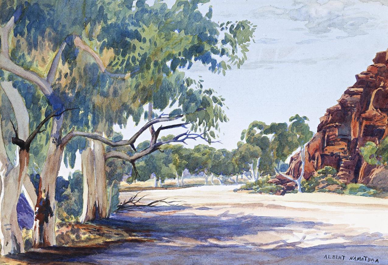 A standing guard of ghost gums in the foreground of this painting draws the viewer’s eye through the meandering bends of the riverbed toward the deep tonal contrast provided by the iron-rich monolith’s rock face. Namatjira was a naturalist and a tonalist, whose patrilineal totemic connection to the sites of the Central Desert formed the bedrock of his art and provided plural meanings for those viewers who could read them. Wenten Rubuntja, artist and Chairman of the Aboriginal Areas Protection Authority in Mparntwe, where Namatjira lived, explained the sensitivity to plural meanings required in the appreciation of his artworks: ‘we’re not photographers, taking pictures. The country has got sacred sites, that stone, that mountain has got Dreaming and himself is sacred country. Not just free mountain. We sing that one – we got that song. Well, the song is the history of the country. […] Albert Namatjira used whitefella’s side of the story – he painted landscape. He painted the Twerrenge (Dreaming) side there as well. Namatjira used two Laws’.1