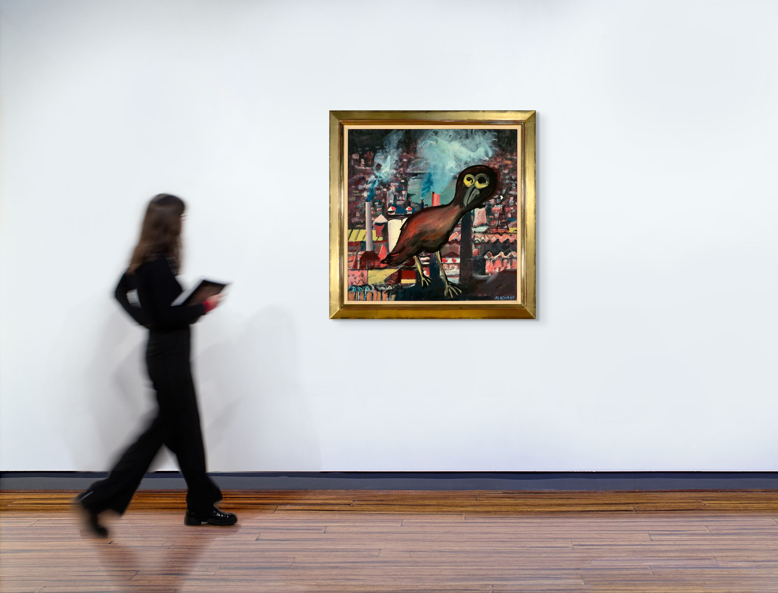 As early as 1950, Blackman identified with birds, writing to Barbara: ‘There are love letters, newsletters, and fish and bird letters, or there used to be, that is; but now the metamorphosis is complete. I am purely and simply a bird so all you will receive are bird ones.’1 In May 1951 the Blackman’s moved into a disused coach house in Hawthorn, which Charles quickly converted into a living space and studio. By this time, he had already met many of Australia’s most important artists of the period, such as Joy Hester, Arthur Boyd and John Perceval, as well as the influential patrons John and Sunday Reed who showed him Sidney Nolan’s ‘Ned Kelly’ paintings, which were stored at their farmhouse Heide. Brimming with inspiration, Blackman set to work, and mounted an exhibition at the coach house in 1952. He was delighted when Danila Vassilieff, visited the show. ‘We were honoured at his coming. We knew his myth, this Cossack adventurer.’2 Vassilieff was impressed by what he saw but warned Blackman to ‘get off Sid’s back. He’s not a horse, you know,’ a recognition that the young artist needed to find his own voice and not just ape the work of others.3 Rising to the challenge, Blackman began a sequence of new works featuring cats and birds, as well as his earliest depictions of schoolgirls. The Blackmans travelled to Brisbane after the exhibition, staying at Barbara’s mother’s house in Kelvin Grove, and here he painted the self-portrait Boy with a bird, with the figures set against a collage of ‘Queenslander’ houses, wallpaper and vegetation. Following their return to Melbourne, he painted Bird over the city, which reconfigures the background to include Richmond’s brewery silos set hard against chimneys of the State Electricity power station. Indeed, it is not hard to imagine some of his schoolgirls scurrying through these darkened lanes. When Bird over the city and its related works were exhibited in Adelaide in 1953, he was praised for the ‘movement (and) vitality’ of his paintings4, with senior artist Ivor Francis going so far as to claim that Blackman was ‘the most stimulating, original and promising younger painter we have seen for a long time.’5