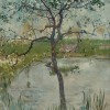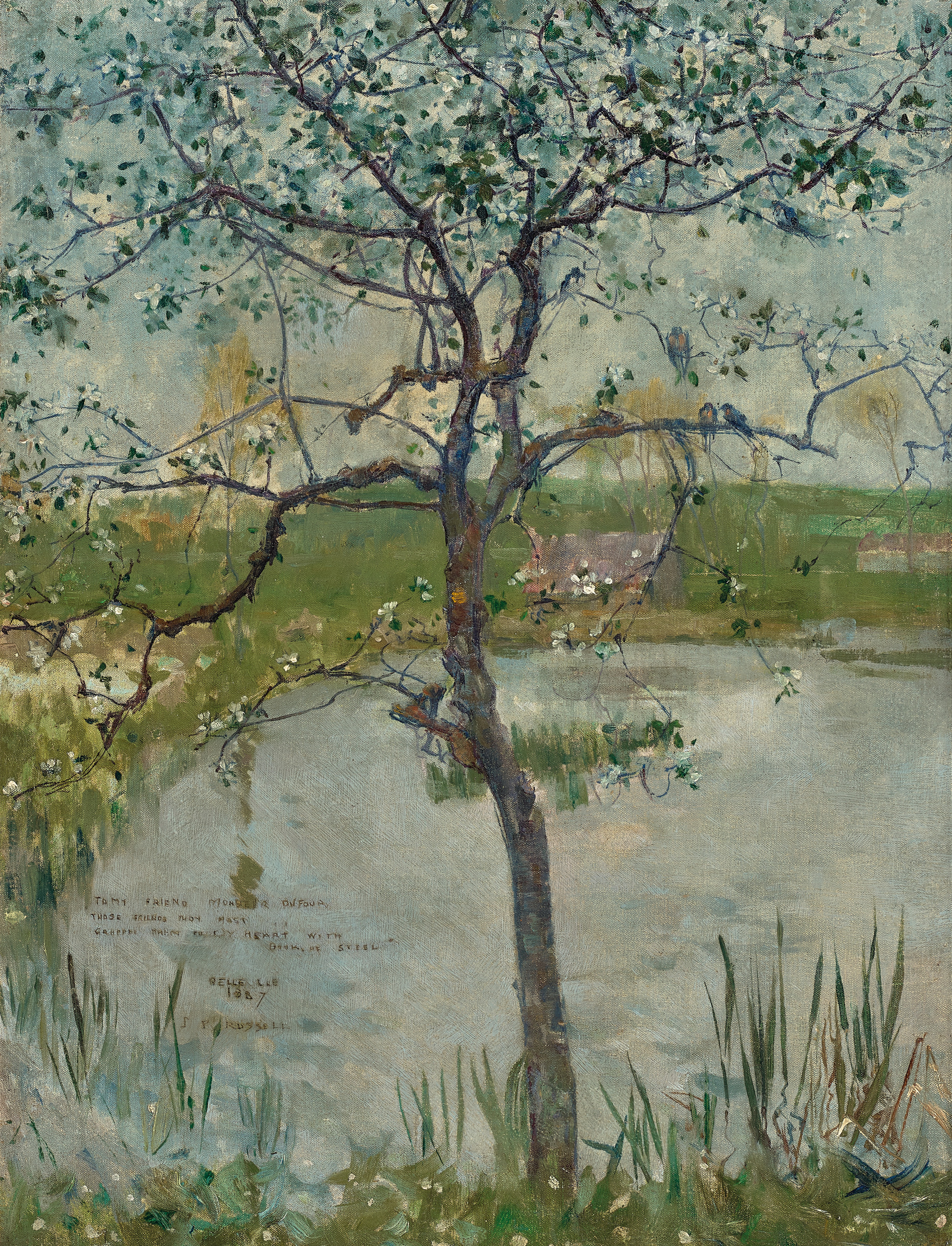Russell had a deep interest in Japanese art and this is reflected in A Blossom Tree, Belle Île, 1887 and a number of other related paintings of spring blossoms made around this time, including The Garden, Longpré-les-Corps-Saints, 1886 (private collection) and Almond Tree in Blossom, 1887 (National Gallery of Victoria). Russell had seen Japanese ceramics and bronzes in the 1879 – 80 Sydney International Exhibition, but a broader interest was stimulated by van Gogh who collected Japanese ukiyo-e woodblock prints (as did his brother, Theo, and Monet) – developing a collection which numbered in the hundreds – and encouraged him to do the same.6 Russell absorbed the lessons of Japanese ukiyo-e design, introducing flattened pictorial space, distortions of traditional perspective and dramatic cropping of subjects to his compositions. Almond Tree in Blossom, 1887 (National Gallery of Victoria) employs bold cropping and a close-up view of the blossom-covered branches, which are flattened in space against a solid but shimmering background of powdered bronze paint, itself a reference to the gilded backgrounds of Japanese screens.7 In this painting, the dramatic reflection of the tree trunk connects the reedy foreground, the central band of water, and the distant grassy bank – with a small cottage pictured just right of the tree – within a tightly compressed space. Prominently positioned at the front of the picture plane and filling the entire top section of the canvas, the blossoming tree and its beauty is Russell’s focus. The delicacy and transience of this seasonal flowering provides a poignant contrast to the dedication Russell inscribed to his friend Monsieur Dufour, which reads, ‘Those friends thou hast, grapple them to thy heart with hooks of steel.’