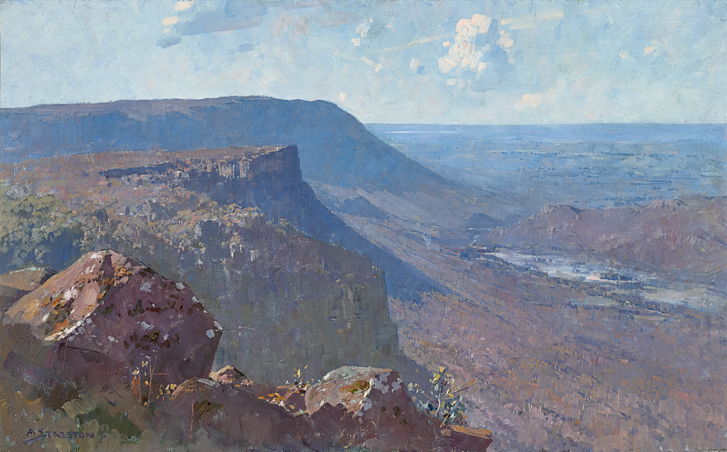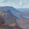 The eye-catching closeness of the foreground rock formations, made up of animated strokes of the brush, enhances identification. In turn, their sharp focus and outline emphasise the precipitous drop, providing an effectively dramatic introduction to the scene, awe-inspiring in imagery as in technique. Rugged escarpments compete with vastness, the ancient land mass metamorphosed by the poetic play of sunlight and shadow, enveloped in the subtlest of blues.