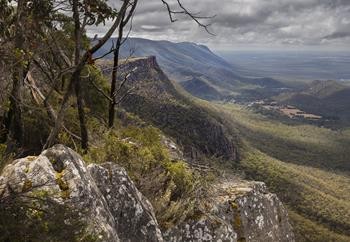 When painting among the Grampians Hills, I found that my best subjects were visible from the crest of the Peaks: it took a hour’s steady climbing laden with canvas colours easel palette lunch & billy of water … pausing halfway for a breath & looking up at the dizzy heights … But once perched upon the Sundial Peak, above the world, the reward is evident in a vast expanse of pale blue over myriad gums rising to Mount Rosea, or over Boronia Peak to Stawell 20 miles to the East.9