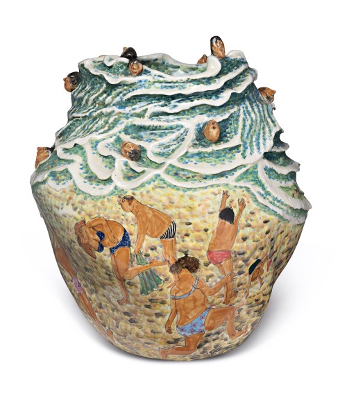 BOARD RIDERS AND SUNBATHERS ON THE BEACH, 1995