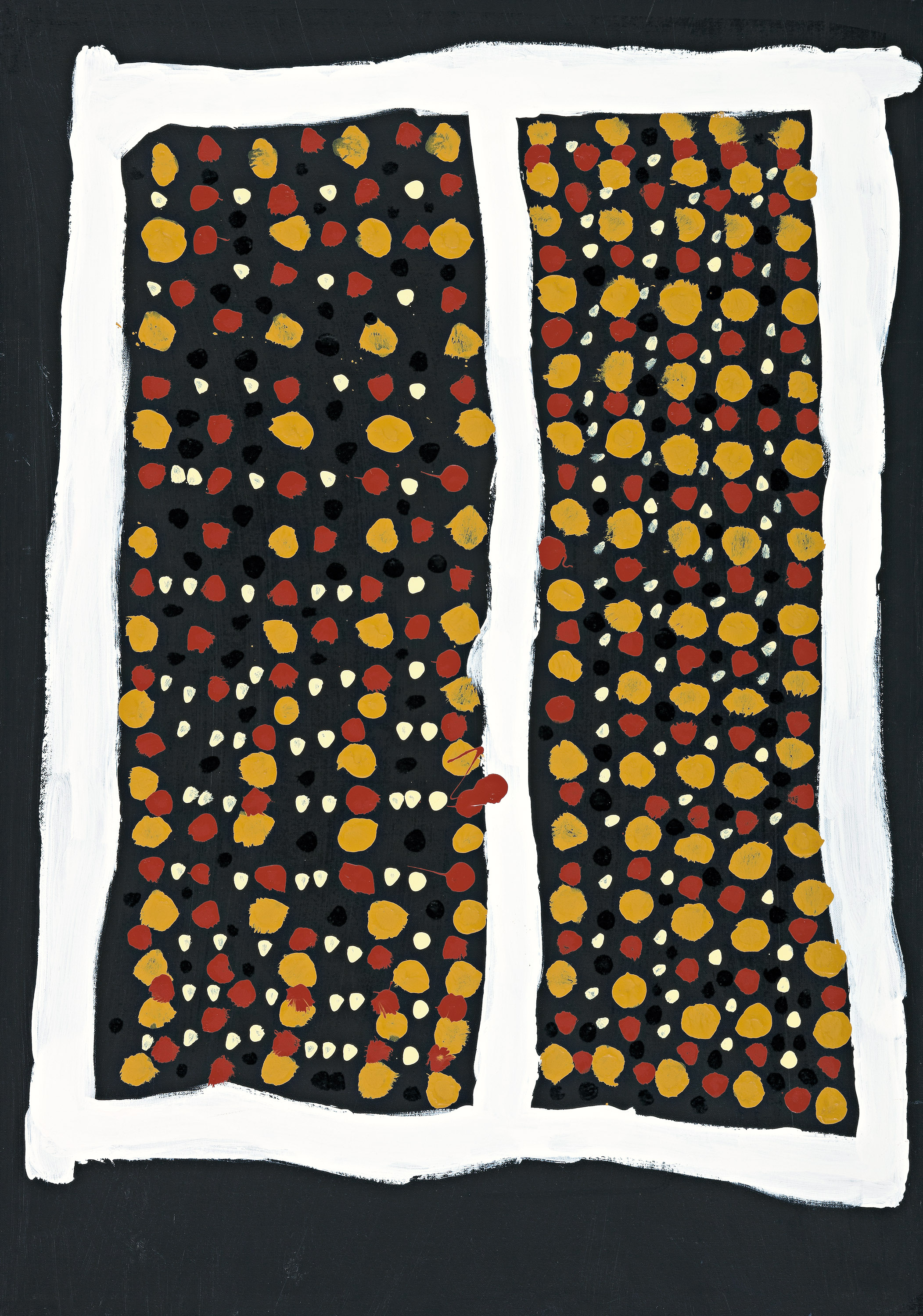 Painted on a black ground, Body Marks, 1999 reinforces the ceremonial body decorations that Prince of Wales wanted to preserve in his painting. The alternate-coloured dotting of the body marks in this particular example is contained within a border of bright white, framing the pattern of red, yellow and white dots together to create an intense energy within the work. These are the markings Prince would have originally painted onto the bodies of his clansmen prior to a ceremonial dance but here they are transferred as a permanent record for posterity. The work was painted just over a year after his landmark solo exhibition of 1997 at Gallery Gabrielle Pizzi in Melbourne.