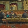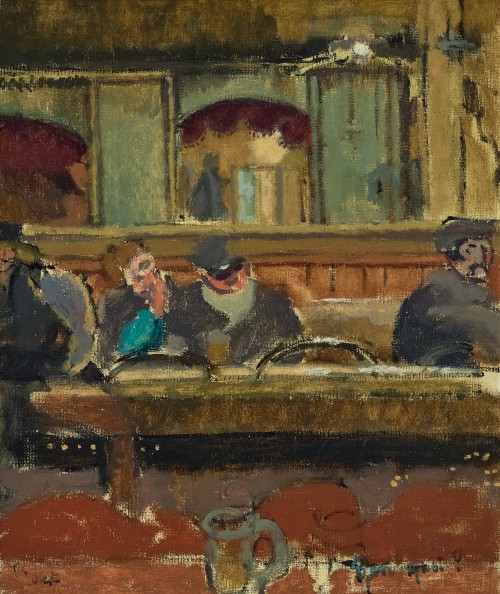 Grieving and alone, Sickert moved into a new studio near Dieppe harbour in 1921, focussing on figure paintings and scenes around the town. In particular, he painted a sequence of interior and exterior views of the cafe-cabaret (beuglant) Chez Vernet, located at the far end of the Quai Henri IV facing the harbour. Sickert passed the time there each evening sketching patrons and performers while waiting for the gaming tables to open at midnight at the town’s famed casino. In Bon Quoi?, the artist shows customers seated at one of the tables which ran down the left-hand side of the narrow venue, also seen in such works as Au cafe concert, Vernet’s dance hall, 1920 (private collection); plus details of the interior walls visible in O nuit d’amour, c.1922 (Manchester City Galleries). Unable to rekindle his former happiness, Sickert returned to England in late 1922 and settled near Bath, but his lingering sorrow is underscored by the piquancy of the title Bon Quoi?, which translates as ‘what’s the point?’.