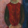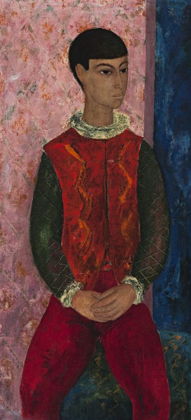Christine France, in her 1987 monograph Justin O’Brien: Image and Icon, suggests instead that the artist’s stylisation had much more in common with the School of Paris, particularly Modigliani and Picasso.1 Boy in Costume supports this hypothesis, continuing the legacy of Picasso’s melancholic harlequin and acrobat paintings of his famous Rose Period (1901 – 1905), themselves informed by the work of the French 18th century court painter, Antoine Watteau.2 The classical three-quarter profile of this boy in costume projects an evasiveness and emotional distance consistent with the deception inherent in the dramatic figure of the Harlequin, borrowed from 16th century itinerant entertainers of the Italian Commedia dell’Arte. This portrait can be read as a tender study of teenagehood – the complexity of identity and search for a place in the world – the boy is portrayed to the world as both a performer and a multi-faceted individual.