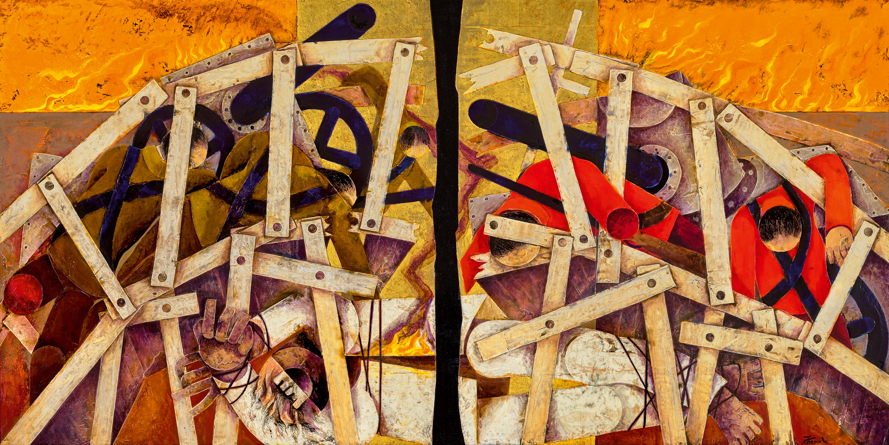 French travelled widely throughout South Africa but The Bridge is not based on a particular place or event and it offers no direct social comment… [Rather] The Bridge is about people… The subject is a synthesis of contradictory and complex sense-experiences, encounters with people from all sectors of the community, and information about South Africa. The assimilated sources are transformed into an image that explores the tension between opposing forces and the literal and metaphorical implications of the concept, ‘bridge’. A bridge is a physical structure erected to afford safe passage over a barrier and its presence directs human beings along a specific route. It may be a transitional phase connecting two conditions and, in this sense, it is a very apt metaphor for the situation in which South Africa found itself as the architects of apartheid attempted to plan new social routes. Since a bridge facilitates movement and manifests human skill at overcoming impediments, its collapse initiates chaos, signifies human fallibility and implies failure of a system. French depicts a bridge that arches across his entire format and is torn asunder in the centre.