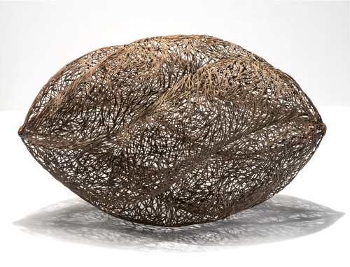 Oliver’s sculptures, although often bearing mimetic titles such as bud, pod, chrysalis and shell, are not about nature, instead their appearances are shaped by the conceptual power of natural forms and the effects of their shape and volume in physical space that surrounds them - breathing and moving in three dimensions. In describing her most successful works, Bronwyn Oliver remarked that with a perfect combination of concept, medium and execution, the sculpture would ‘sing’, and using a ‘poetry of association’, would transcend conventional markers of time and space.2 The instinct to grapple with poetic associations is human, and a carefully laid trap that Bronwyn Oliver, as Arachne, has woven for her audience. Self-contained, Bud twists and concertinas, its shining woven copper threads and tendrils glowing with internal and reflected warmth and inviting tactility. Presenting a sense of wholeness, its enigmatic existence remains unquestioned and immutable, as though Bud had appeared in this world fully formed. This elegance and masterful resolution, however, belies the punishing, labour-intensive process to which Oliver was so rapturously committed - the painstakingly manipulated twisting and welds of pliant copper wire here creating an intricate ‘weave': the microstructure of her organic sculptural form, open and geometric, allowing light to permeate and magnify its decorative surface patterns.