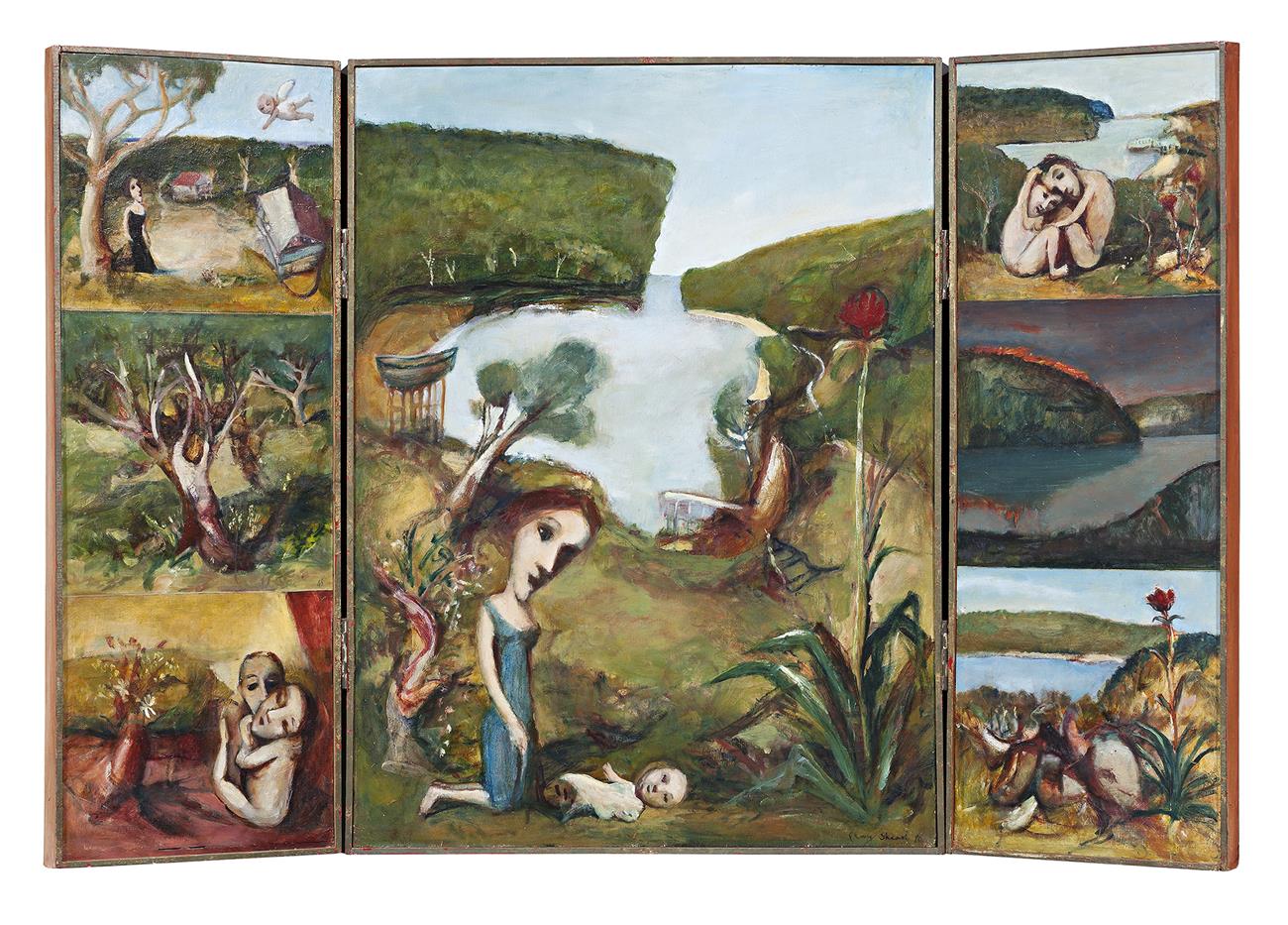 Fully opened, the Bundeena Icon is a lyrical and joyous celebration of coupledom and nurturing of new life. Its panels contain allegories of the Mother and Child, vignettes expressing the couple’s unbridled erotic connection, and landscapes illustrating the bucolic serenity of their immediate natural environment – the town of Bundeena on Sydney’s South Coast. This painting transposes Shead’s intimate and personal mythology on to traditional scenes of Christian iconography, including the Annunciation scene (complete with a whimsical flying cherub) in the upper left. The sentimental and metaphorical quality of Shead’s Icon is reminiscent of the works of French painter Marc Chagall, a connection further emphasised by the soft, warm palette they shared.