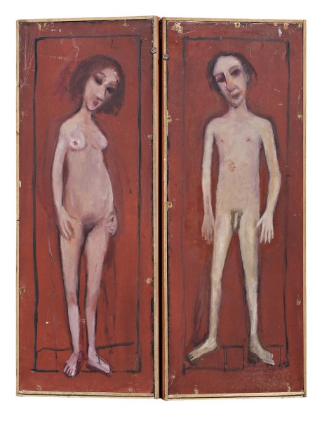 Two simple nudes, a man and a woman, each standing unabashed within loosely sketched frames, guard the outer panels of this major work Bundeena Icon, 1990. In appropriating the figures of Adam and Eve from the Van Eyck Ghent altarpiece, a masterwork of the Flemish Renaissance, Garry Shead alludes to the allegorical nature of the tableaux full of personal metaphor hidden within. Shead is one of the few contemporary Australian artists to explicitly use familial relationships within his paintings, and here, the central female figure bears a striking physical resemblance to his wife, Judit. Created at a time of hitherto unparalleled peace and harmonious family life, it was in this painting that the artist distilled his personal delight in the landscape and companionship of Judit and their new baby daughter, Lilla. A standout painting in both exhibitions in Adelaide and Canberra, this triptych was described in a newspaper review at the time as a ‘personal affirmation of life’.1