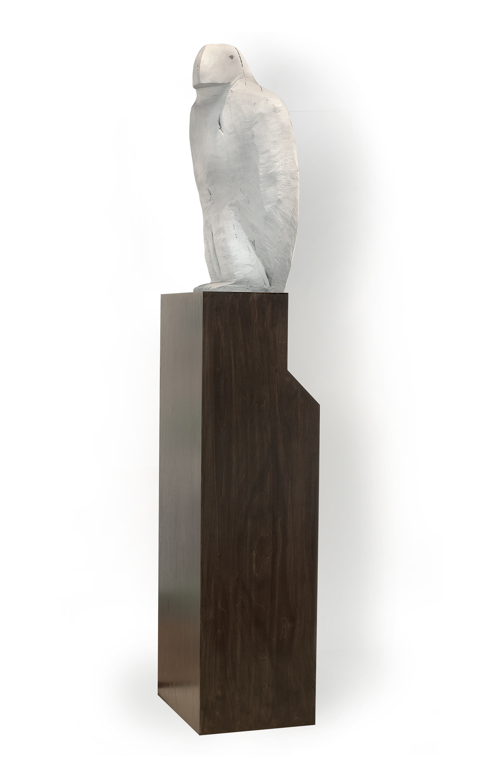 Painted a uniform white with pigments mixed with marine acrylic (a defensive weather patina), this bronze Bunjil stands proud with a striking silhouette, his eyes narrowed and beak slightly lowered, a watchful sentinel. Armstrong’s simplified colours and volumes serve to highlight the tactile surface texture of the bronze, the grooves and rough traces of his carpentry tools having been preserved throughout the casting process. This carved muscularity creates a raw commanding presence for Armstrong’s broad-shouldered bird of prey, evoking the ancient power of the wedge-tailed eagle creator spirit and ancestral being of the local Kulin Nations of South-Eastern Australia.