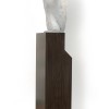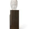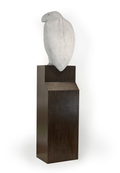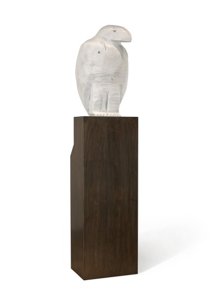Towering high, perched on a smooth-edged timber plinth, Bruce Armstrong’s gleaming white bronze eagle, Bunjil, 2003 surveys his domain. Best known for having created monumental heraldic animals built to exist in open public spaces, from 2003 – 2012 Armstrong also created in parallel a small suite of editioned bronzes based on selected timber sculptures. From a small edition of 9, each with its own unique timber plinth, this eagle was amongst the first to be cast and coloured by Bill Perrin, whose technical prowess simulated almost exactly the materiality, appearance and texture of the artist’s original timber maquette.1 Originally conceived around 1996 as a painted timber totem roughly hewn from cypress wood, the simplified polychrome design of a sea eagle at rest was later scaled-up into a vast seven-story aluminium public sculpture, Eagle (also known as Bunjil), commissioned by the Melbourne Docklands Authority in 2002.2 Later joined by the pair of aquiline Guardians, 2009 installed at the entrance of the Hyatt Hotel, Armstrong’s avian sculptures have changed the aesthetic fabric of the city of Melbourne and provided its urban environment with a deeper, more spiritual connection to the land.