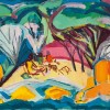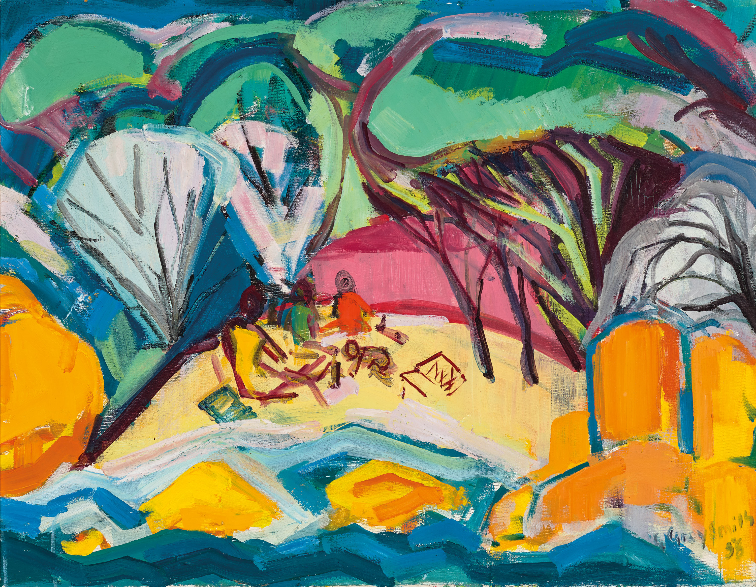 Bunker Bay, 1958, is one of a number of his paintings of the locale and sits at the mid-point of his development from a post-impressionist technique to his mature ‘slab form’ paintings from 1960 onwards. Grey-Smith first studied art as a convalescent former-prisoner of war at a sanitorium in southern England where he was treated for tuberculosis in 1944. He then trained for two years at the Chelsea School of Arts before returning to Western Australia in late 1947, visiting the forests of Fontainebleau en route in homage to his hero Cézanne. In 1952, he painted his first view of Bunker Bay (untraced) and the following year, he and his artist-wife Helen returned to London where he studied fresco techniques. Whilst there, he was mesmerised by an exhibition of the high-colour works of the French Fauves and his subsequent paintings exhibit his attempts to unite these disparate influences. For Bunker Bay, Winter, 1956 (private collection), Grey-Smith stood at the eastern edge and fills the scene with radiant colour – jarring in its contrast – contained within bold outlines, set against solid patches of pigment, indicative of similar results achieved consecutively in his frescos. For the painting on offer here, a similar approach is present but there is also greater fragmentation as he allows his brush to dictate the passage. His treatment of the tree canopies as self-contained entities is distinctly his own and can be seen in works as early as Dongara Flats, 1950 (Edith Cowan University) and Jarrahs, 1953 (Art Gallery of Western Australia). The contrasting cadmium yellow of the boulders in this lot illuminates the foreground and gives the sense of a sun-drenched whole, indicating that it was the summer school holidays when the journey was undertaken.