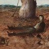 The Burke and Wills works were painted at the same time as the Central Australian series, the first pictures completed within two months of Nolan’s return from his inland travels. Finished in July 1950, Burke Lay Dying, 1950 was the second depiction of the ill-fated explorer2 who, realising that death was imminent, is reported to have asked a fellow member of the expedition to ‘place the pistol in my right hand and … leave me unburied as I lie.’ In the first painting Burke is dead and his body is beginning to merge with the landscape, but in this work Nolan forces the viewer to confront the humanity of his subject in an image of a man defeated. The extraordinary pathos of this image is emphasised by the delicacy of its depiction – the paint so lightly handled and burnished back to expose the white ground underneath that it appears almost translucent – and tiny yellow wildflowers shown growing in the ground around Burke, an optimistic symbol of life and regeneration.