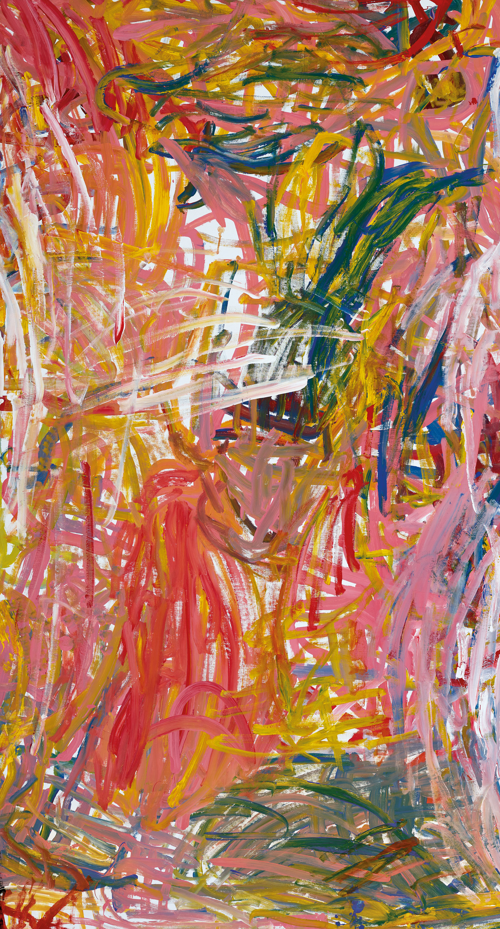 Bush (Emily’s) Dreaming, 1996 is a vibrant painting that belongs to a group of works produced between 1995 and 1996. This phase of her production was characterised by tangled massing of lines sometimes scrawled across the canvas. Scribbled in character, these rapid, multicoloured marks evoke the spiky angularity of desert grasses and contrast with the solid meandering lines of the preceding yam paintings. Sometimes translucent in nature and at other times thick and textural, their immediacy shows a speed and energy in brushwork.