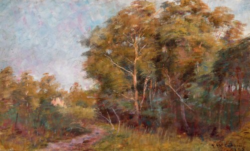 Significantly, McCubbin named their family Macedon home 'Fontainebleau' after the forest in France, neighbouring the village of Barbizon and its school of plein air painters, especially McCubbin's favourite, Corot. Devoting himself to painting in the open air, he even dug a trench in the ground so that he could reach the canvas tops of The Pioneer. Now in the middle years of his art, his style became broader and vision fresher in response to painting out-of-doors directly from the motif, as readily seen here in Bush Landscape, Macedon, 1905. The smoothly painted, tight style of earlier years gave way to the freer, textured brushstroke and palette knife. These transitions are clearly visible in the comparison of Macedon landscapes such as A Bush Scene, 1903 (Art Gallery of Ballarat), and two works closely related to the painting on offer – The Hillside, Macedon 1904 (private collection, Melbourne), and Sunny Glade.5 In these later paintings, the brushstrokes are applied with such verve that they seem to dance in spontaneous response to the scene. The focus of attention had now moved from the figure to the enchanting play of light, as in Sylvan Glade, Macedon, 1906, in the Bendigo Art Gallery. In radiant sunlight or in shade, each of these paintings captures the characteristic qualities of his beloved bush at Mount Macedon, one of his most fruitful painting grounds.