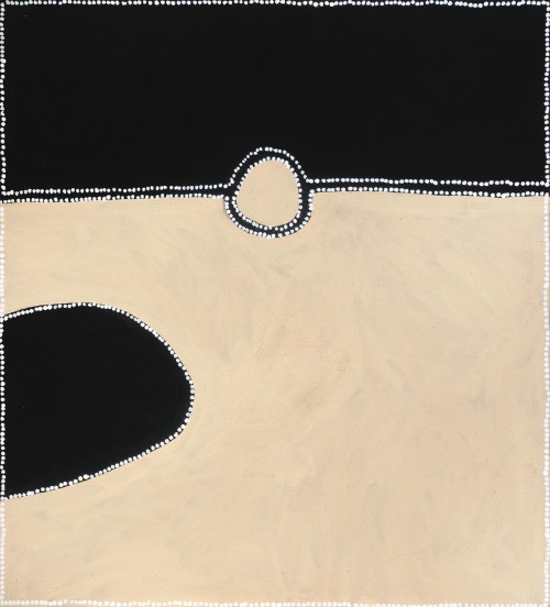 Typified by bold forms and a balance in composition, the paintings of Paddy Bedford are a combination of modern materials and traditional pictorial conventions, contemporary experience and ancient belief systems. His art evokes the rivers, roads, waterholes, rock escarpments and other features of the Kimberley landscape, reflecting the artist’s knowledge of land he criss-crossed in his former life as a stockman. Behind the subtlety and harmony of each composition exists a learned and deep knowledge of the land and its creation stories describing how the landscape, plants and animals were created and in which the laws governing much human behaviour were instituted.