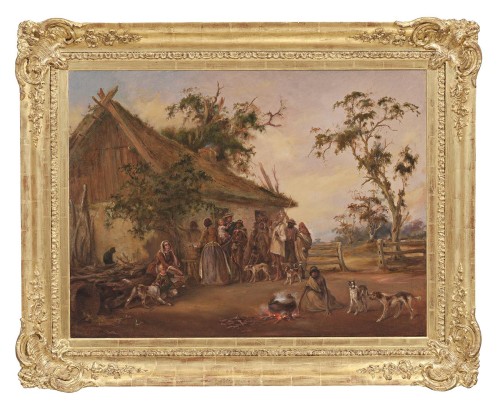 If any single painting by Alexander Schramm serves as an entrée to his Australian career it would be Bush Visitors, painted in 1859, a decade after his arrival in South Australia. This large oil painting has been held in the same family since its original purchase in 1859 by the King William Street watch-maker and jeweller, Henry Muirhead. The painting depicts a group of ten Aboriginal men, women and children (in European clothing, apart from one woman wearing a skin cloak), gathered at the door of a settler’s cottage, importuning the woman of the house while other members of the household observe the situation. What might be interpreted as a straight-forward scene of colonial begging or charity is rendered ambiguous by the friendliness and engagement implicit in the encounter, and by Schramm’s facility in entangling his subjects within a single frame of sociality. The painting is one of Schramm’s larger works and remains in its original frame, fashioned in Adelaide by the city’s first professional framemaker David Culley. On its reverse the painting still bears the original 1859 catalogue number, ‘70’.